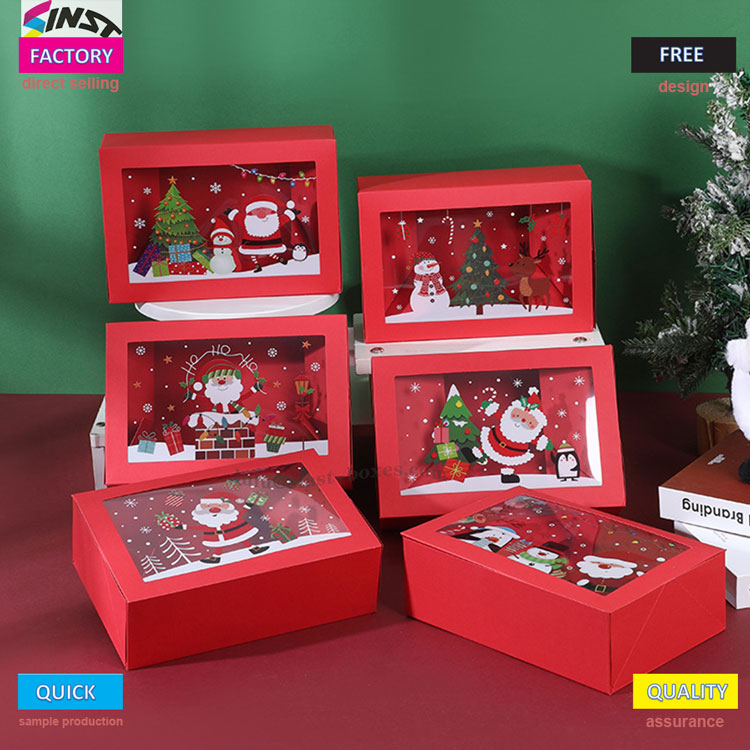 Esta caja de dulces navideños presenta un fondo rojo cálido, un cuerpo de caja rectangular y una ventana transparente, como una ventana para vislumbrar un cuento de hadas invernal. Esta caja de dulces navideñas está hecha de material de papel duro, que puede exhibir los dulces en el interior y tiene cierto grado de estabilidad. Se puede adaptar a artículos cotidianos como chocolate, postres, galletas, gomitas, etc; No es solo un lindo recipiente para dulces, sino también una decoración navideña de escritorio. Regárselo a las personas para uso personal puede alegrar el ambiente festivo, haciendo que cada dulzura esté envuelta en un sentido de ceremonia.