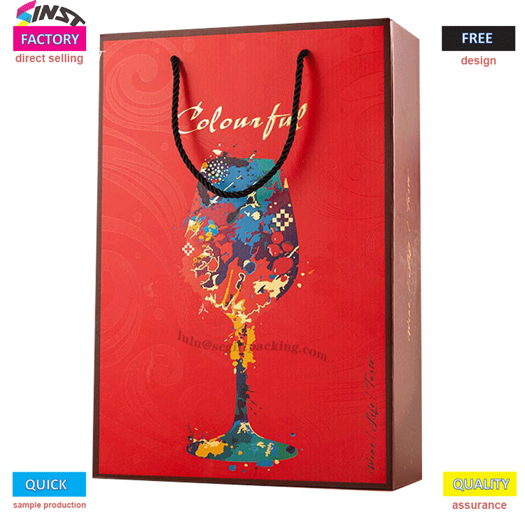 El impacto visual delbolsoEstá oculto en la colisión de "color rojo +". El cuerpo principal está hecho de cartón rojo brillante de alta saturación, que se asemeja a un "lienzo brillante". El frente está impreso con un patrón de copa de vino de patas altas compuesto de tinta colorida salpicada: bloques de colores azul, amarillo y naranja se mezclan libremente, asemejándose a un cóctel oscilante y transmitiendo el tono de la marca de "calidez y diversidad".