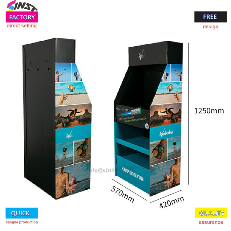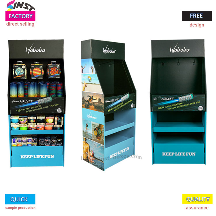 El cuerpo principal del expositor de juguetes para niños es de color azul verdoso con ilustraciones de escenas de juego de personajes, y el lema "KEEP LIFE FUN" en la parte inferior transmite el concepto central de "divertirse". Junto con un diseño de capas abiertas, los niños se sienten inmediatamente atraídos por la escena y pueden dibujar y probar fácilmente planeadores y frisbees; Los padres pueden reconocer fácilmente "este juguete puede traer felicidad" leyendo eslóganes e identificando marcas.